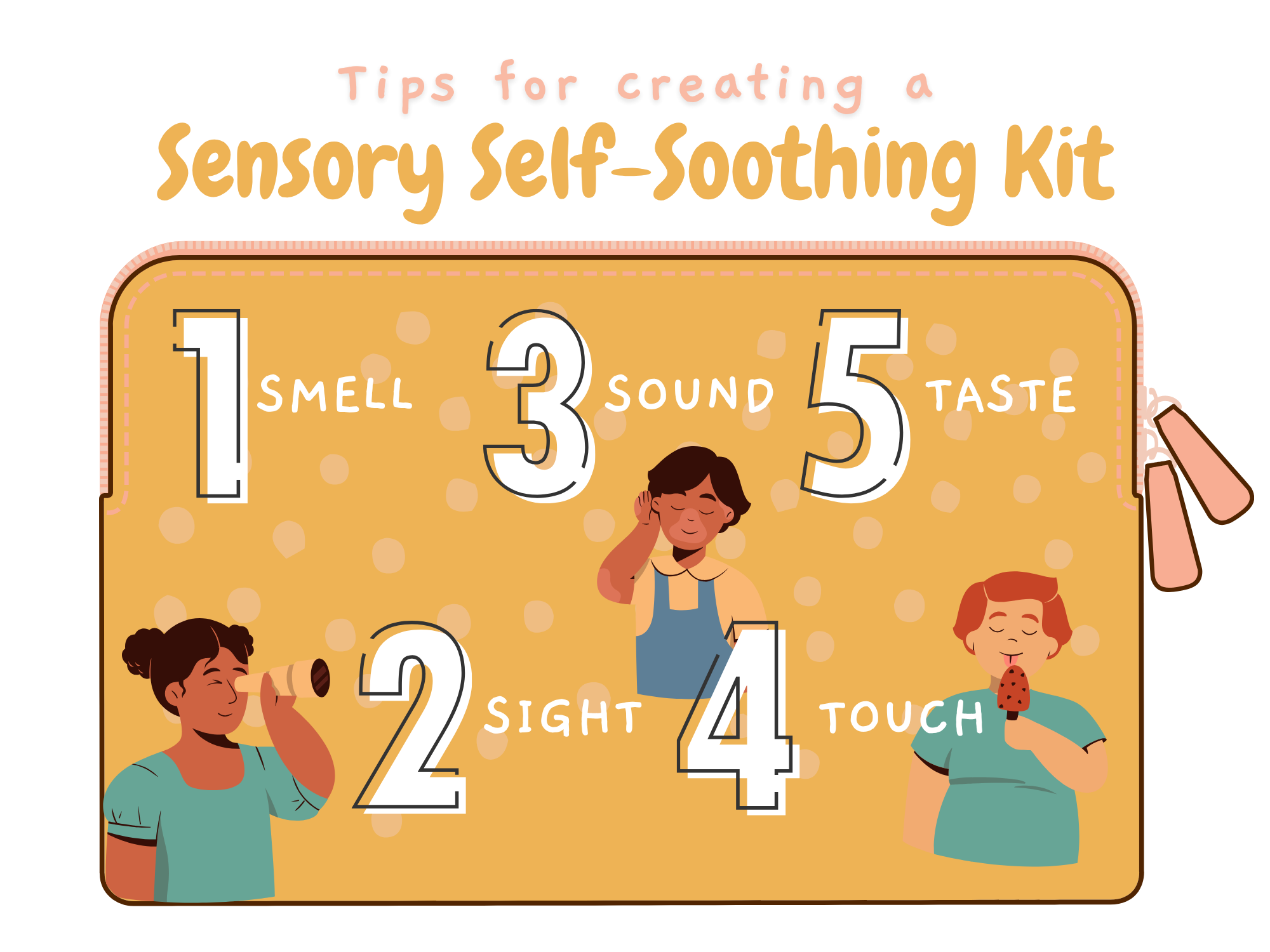 A sensory self-soothing kit is a personalized collection of items that help calm your mind and body by engaging your five senses: smell, sight, sound, touch, and taste.